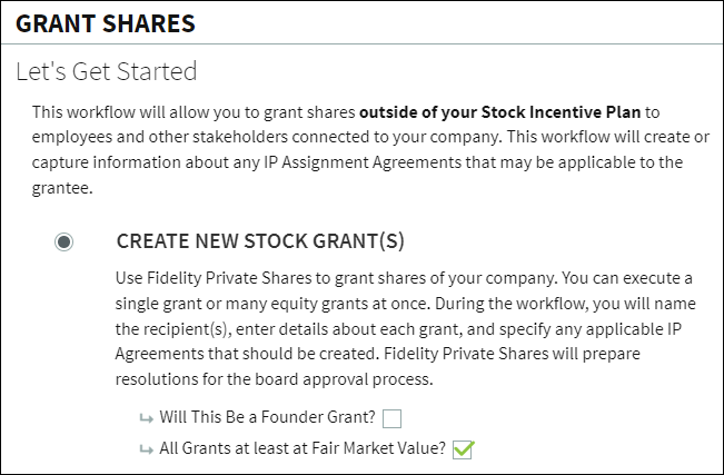 Select Create New Stock Grant(s). Check the first box if these are Founder Grants and check the second box if all grants will be issued at least at FMV. Note these options will affect steps later in the workflow.
