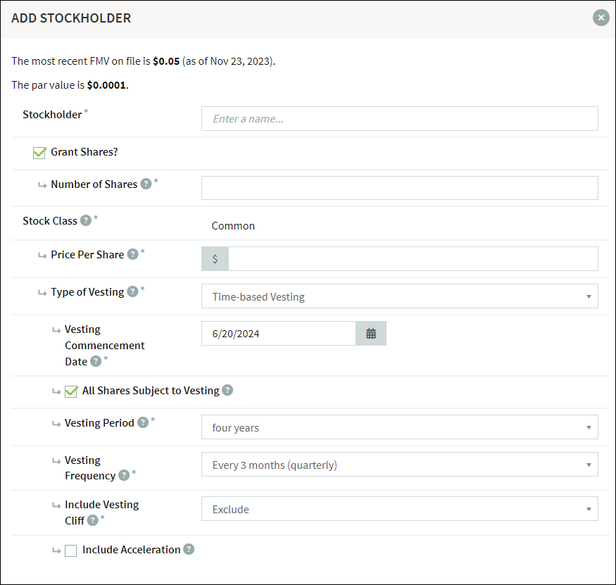 Click Add Stockholder. Select an existing user, or you can select to create a new user. If you create a new user, there will be an additional step in the workflow to send an invite to new users. Enter the details of the grant, including the class of stock, number of shares, the price per share, and any vesting restrictions, and click Save.