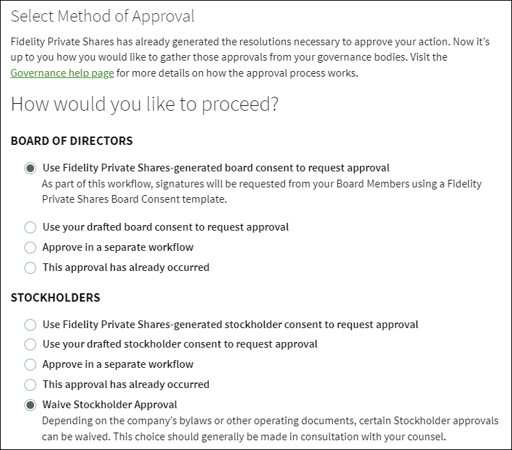 Select the method to use for the Board and Stockholder approvals. If necessary, you can select different options for both the Board Approval and Stockholder Approval.