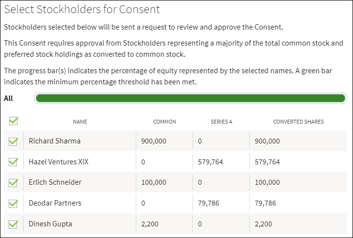 If you selected to generate the Stockholder Approval, select which stockholders should be included. Note that a majority of the stockholders must approve the consent. The bar will turn from red to green once a minimum percentage threshold has been met.