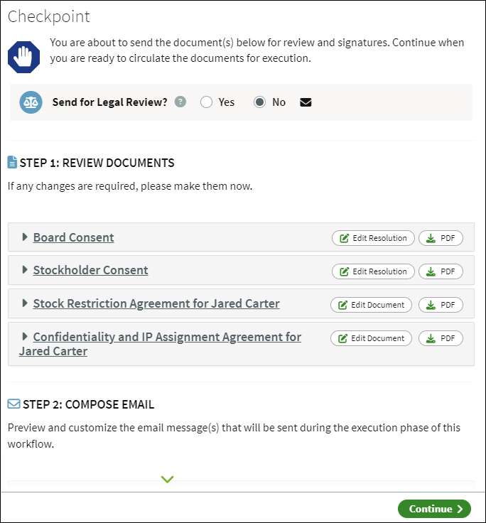 Review the documents carefully. Edits can be made to any generated documents. If necessary, click to Share Documents with others, edit the email that is sente out, or select to have your legal counsel review the grant. When you are satisfied, click Continue. Once you continue forward, documents will be released for signature and will not be available for modification.